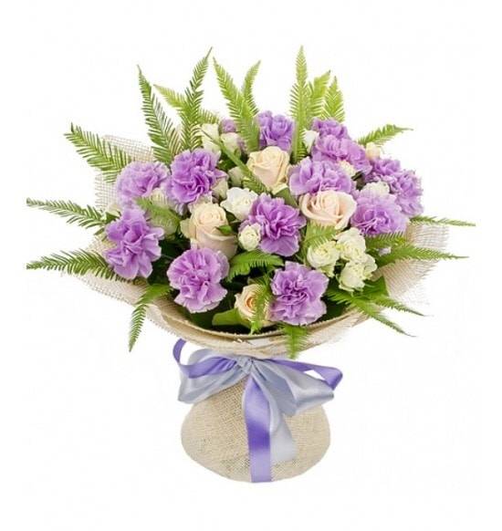 Столь утонченный букет – это подарок, который поможет извиниться перед дорогим человеком, выразить глубокие чувства искренности и уважения. Лиловые гвоздики в сочетании с бежевыми розами составляют изысканный ансамбль, который подарит улыбку и получателю, и вам. Яркую цветочную композицию можно преподнести в честь памятной даты и другу, и коллеге.